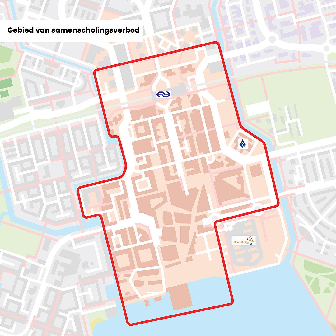 Zie de kaart van het gebied waar het samenscholingsverbod in het centrum van Almere geldt.