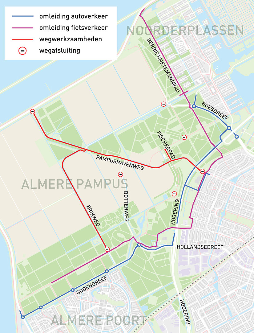 Tijdens de uitvoering zijn de Pampushavenweg, Brikweg en een stuk van het Fischerpad afgesloten voor doorgaand verkeer. Omleidingen worden met de bekende gele borden aangegeven.