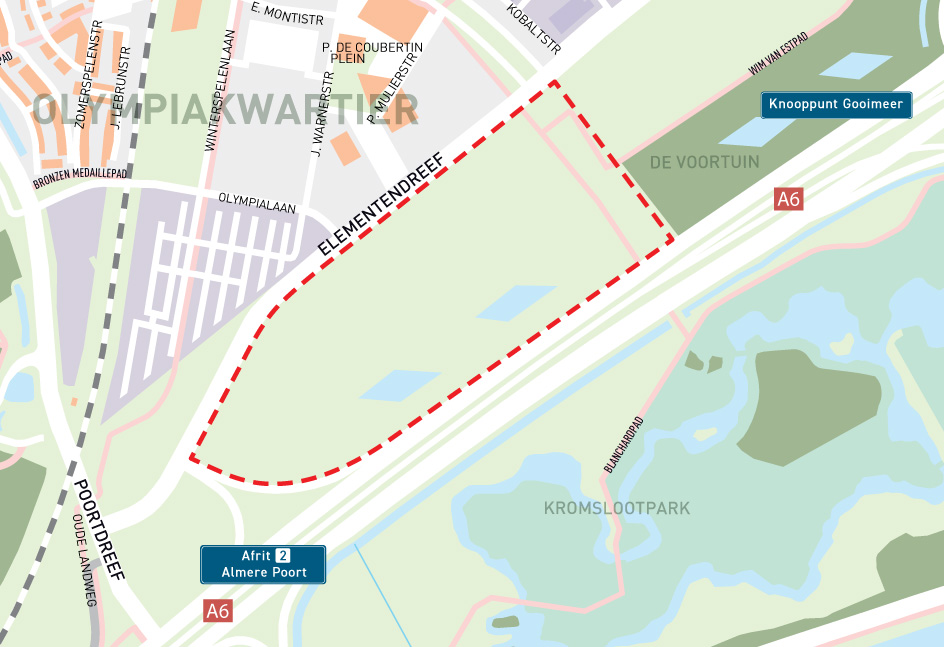 Het gebied ligt binnen de rode stippellijn. Dus tussen de Elementendreef, afrit 2 Almere Poort, de A6 en de Elektronweg.