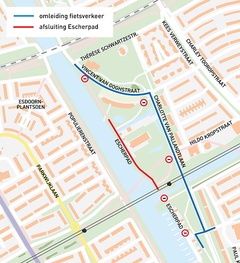 Tijdens de werkzaamheden zijn het fiets- en voetpad afgesloten. Omleidingen worden aangegeven met de bekende gele borden.