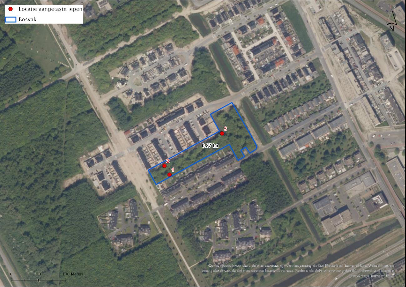 Verdeeld over het bosvak zijn de boomsoorten groepsgewijs gemengd vanuit de aanleg en staan er groepen met iepen bij elkaar aangeplant. Op de kaart (figuur 2) staan drie losse punten aangeven, waar per locatie diverse iepenbomen staan die minder vitaal ogen of zelfs al zijn doodgegaan. Bij locatie 1 staan een aantal minder vitale iepen (figuur 3) en reeds afgestorven bomen (figuur 4).
