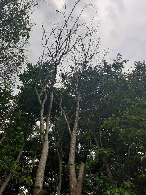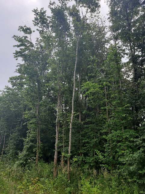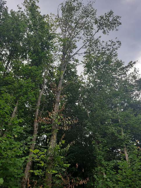 Vervolgens staan er langs de gehele bosrand, met name aan de noordzijde meerdere bomen (zowel iepen als lindes) die door verkleuring van het blad aangeven dat er spraken is van negatieve effecten op de vitaliteit van de bomen.