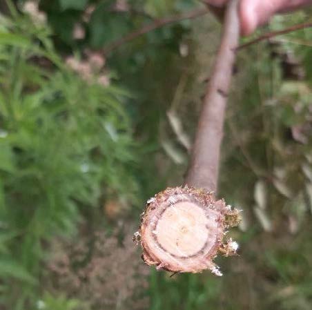 Op locatie 3 staat een enkele minder vitale boom (figuur 7) waar een aantal takken van zijn afgezaagd waardoor de kenmerkende verkleuring in het hout door de iepenziekte goed zichtbaar is (figuur 8).