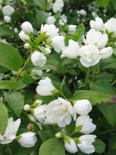 Philadelphus Manteau d'Hermine (boerenjasmijn) en Spiraea japonica Anthony Waterer (spierstruik).